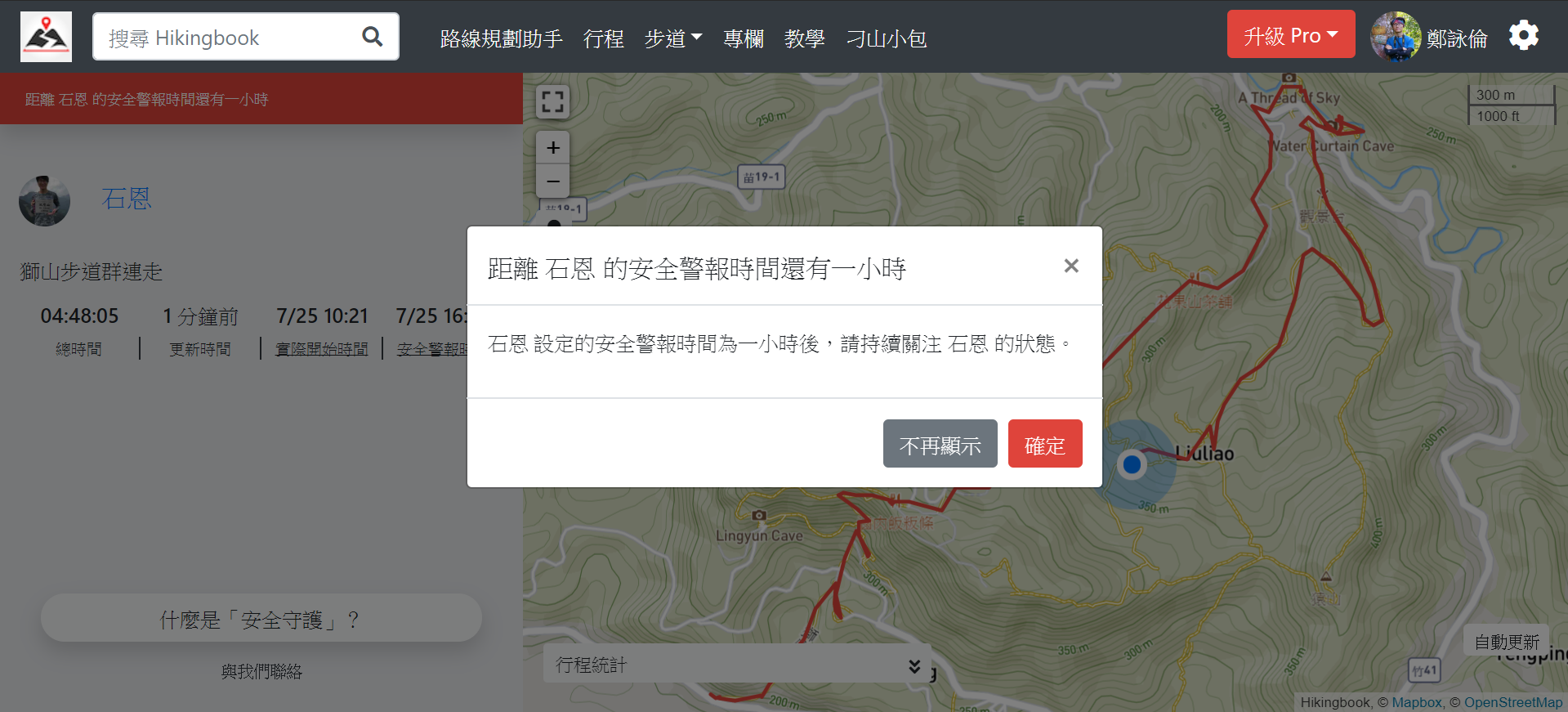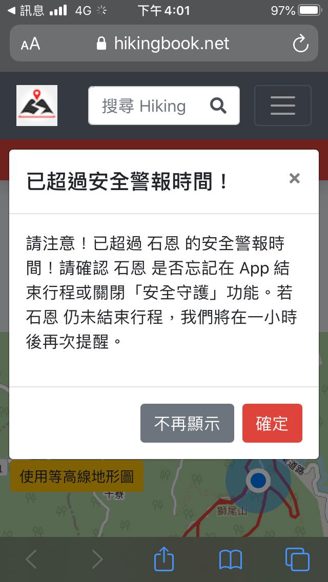 此外,安全守護也設置超時警告的功能,當行程超出預定時間而未結束,留守人就會收到通知,提醒他採取進一步行動。當然,隊伍與留守人約定好每日通聯的時間與地點,儘量嚴格遵守,還是不可減少的!