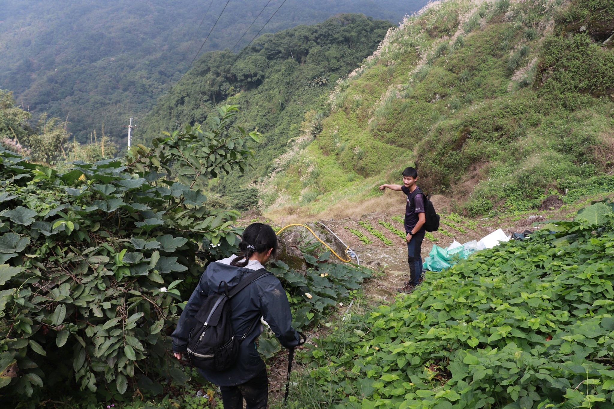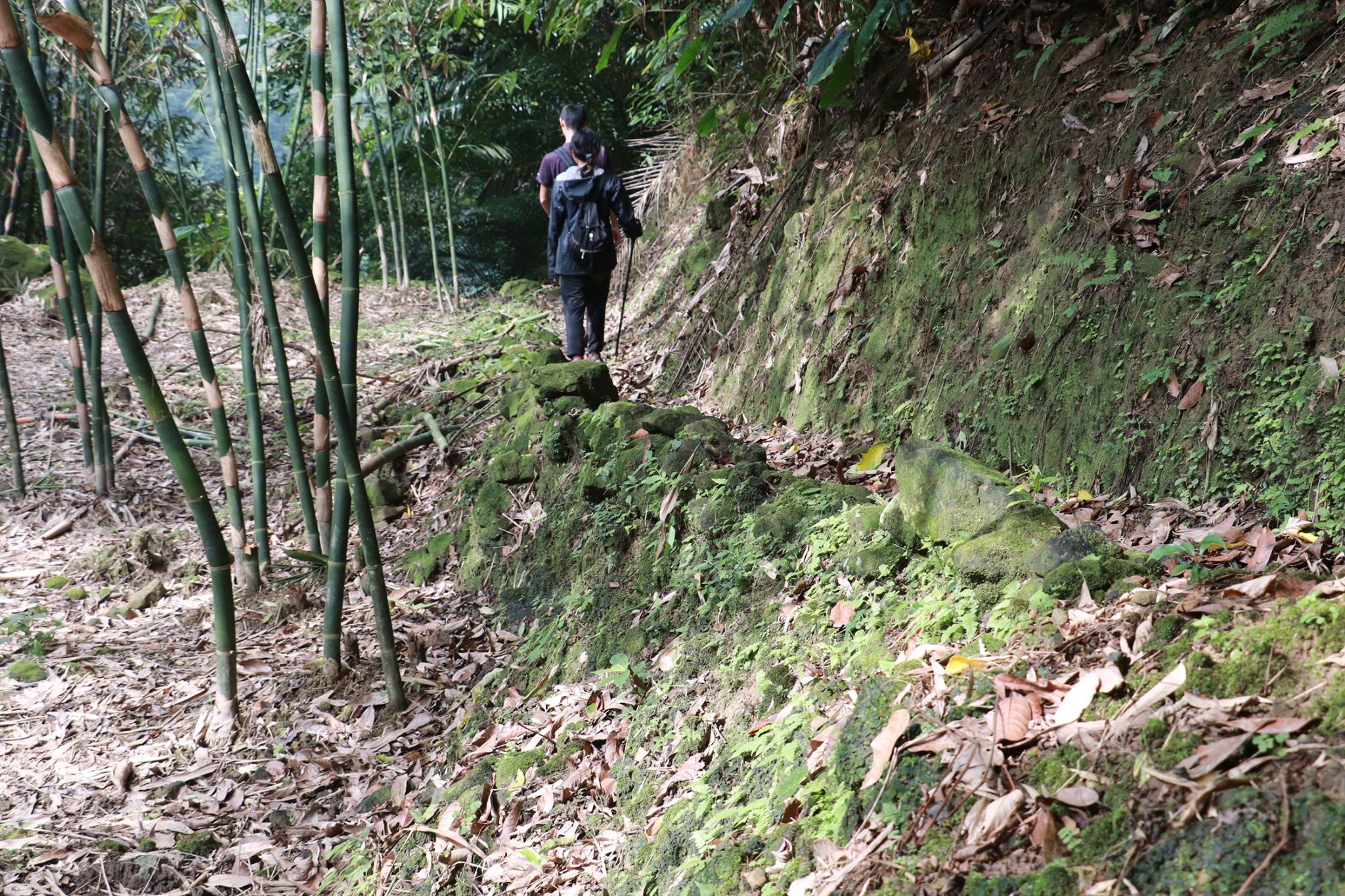 在鞍部岔路吃飽喝足後,我們朝著十份子方向下山,這條路線和適才的原始山徑擁有截然不同的風景。這條「十份子古道」,是百年前日治時代地圖就能看得到的路徑,據說在古早時候,居民就是走這條路把農作物運出的。