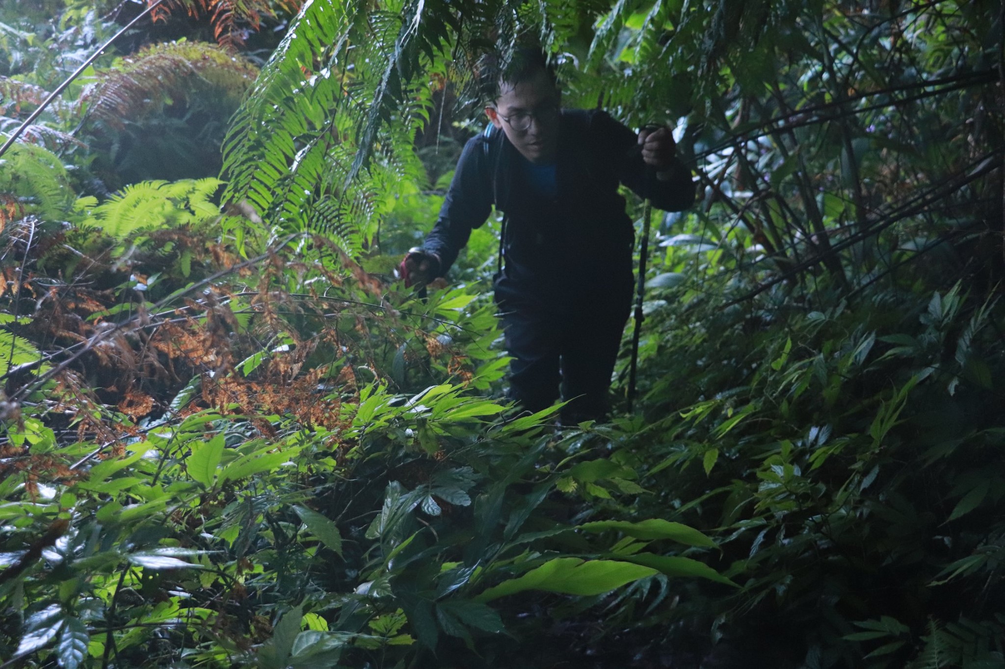 攀登雞心尖的這條路可以說只有阿雜來形容,我們走過陰暗潮濕的溪谷,再加上淋過雨的植物不斷洗刷,讓褲子有如進了洗衣機般全濕了。上山途中,我們還因為偏離路徑、卻又不甘回頭而多花了一個多小時找路,把自己弄得很狼狽。一番拼搏以後,我們總算登上了雞心尖,然而,這還只是原定縱走直潭山列的一小部分呢。