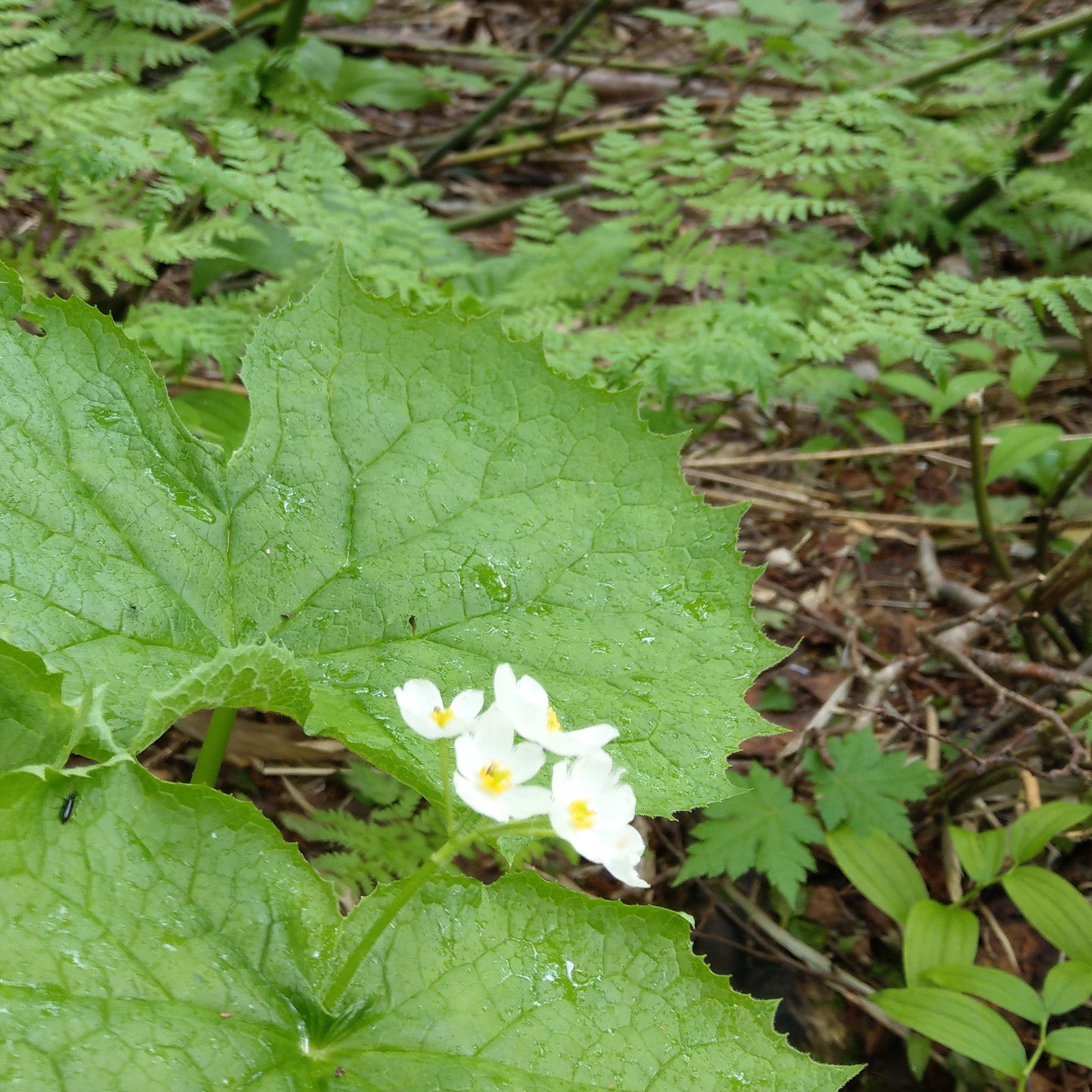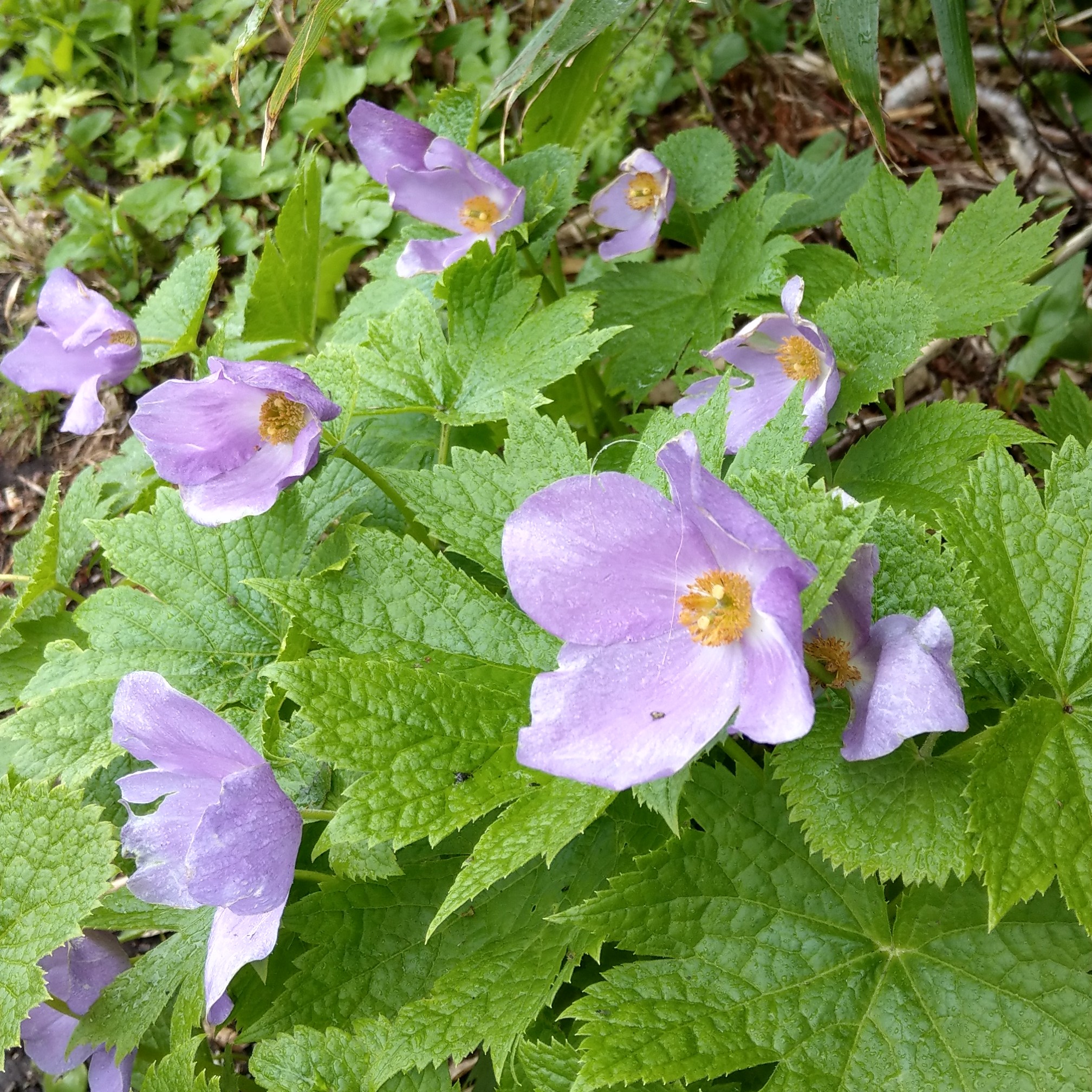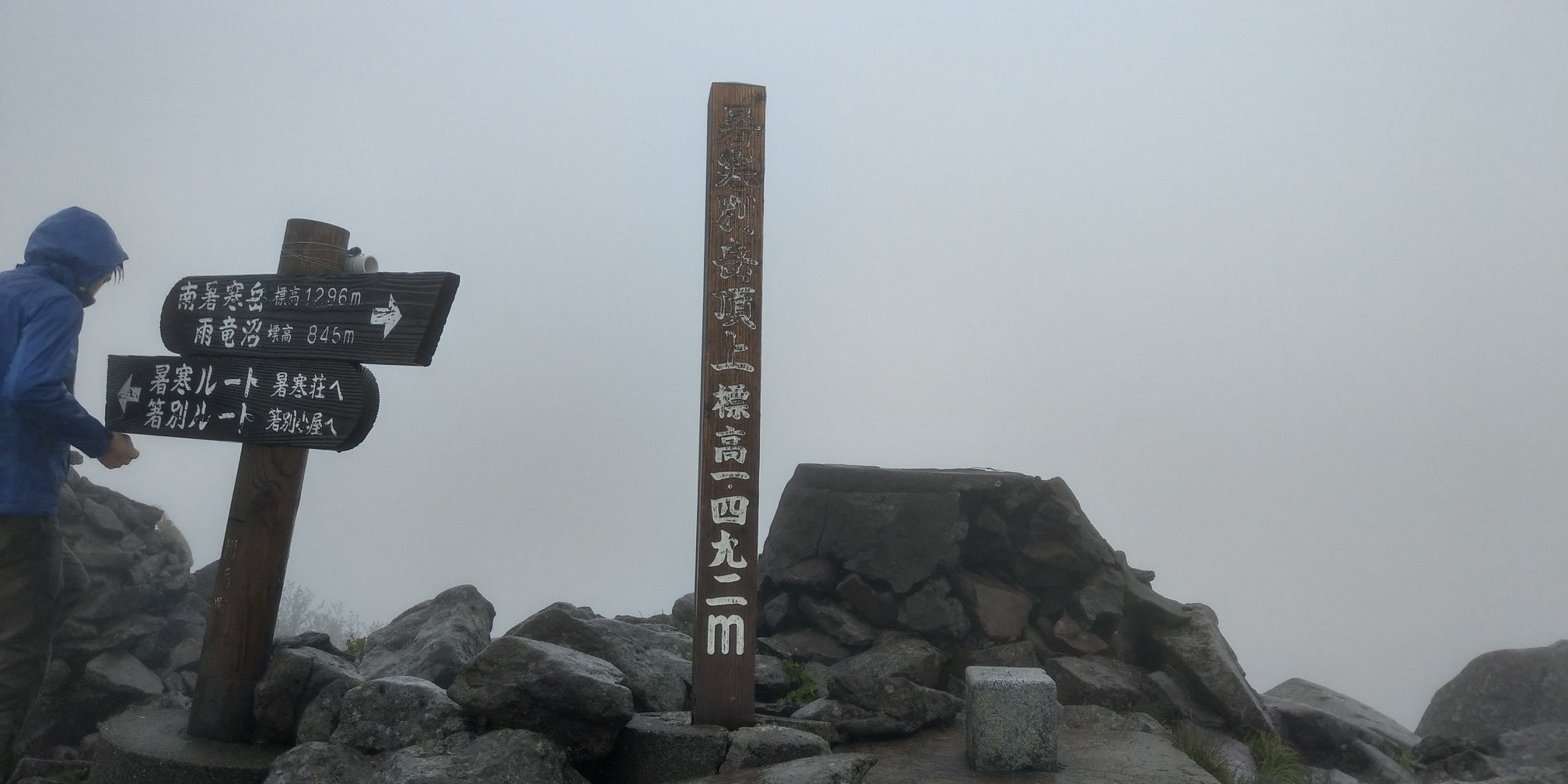 一路上如其名「花的名山」,地上隨處可見高山植物的花朵,如千島風露、山荷葉等這些僅在溫帶才會出現的植物。可惜天公不作美,越往上爬天氣狀況越差,幾處原先期待出大景的地方都被白茫茫的雲霧遮住,山頂甚至是整片白牆,甚麼也見不到。