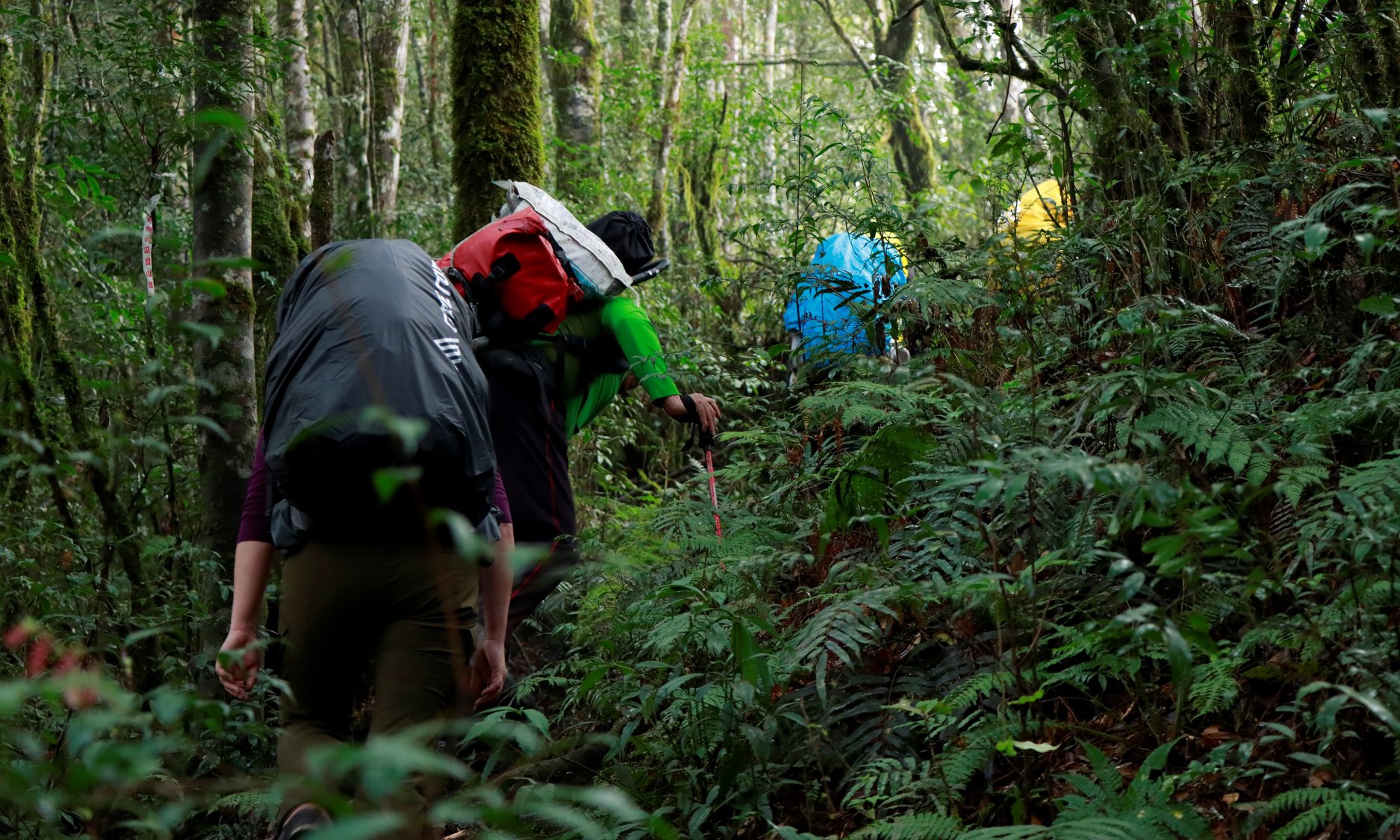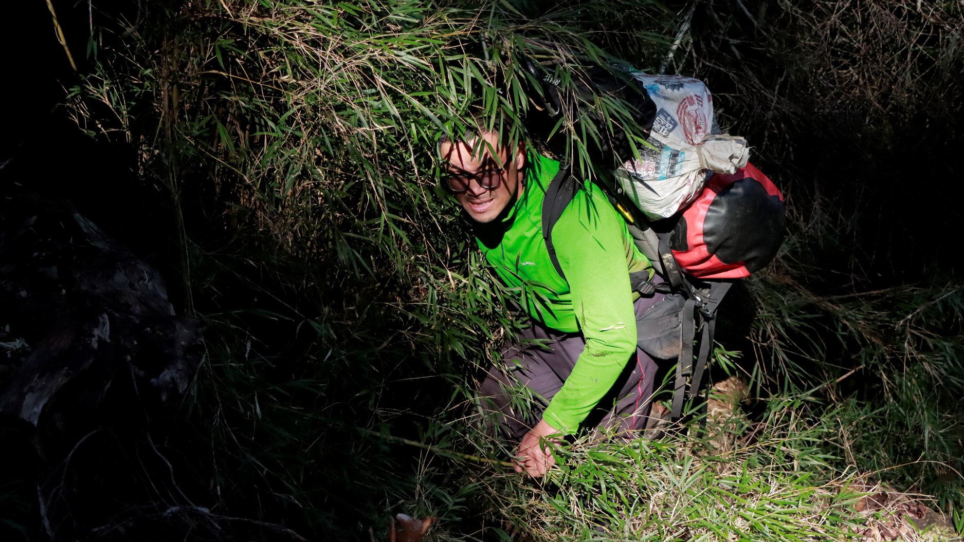 隨著地勢愈來愈高,芒草、箭竹和曲折的灌木枝幹全都糾纏在一起,形成牢不可破的拒馬阻擋去路。我們用身後大背包輾壓,用衝刺的姿勢往前鑽,用全身力量跨越攀爬,衣服裡內褲裡鞋子裡頭上肩上背上全是粉塵與枝葉殘渣,著實狼狽不已。