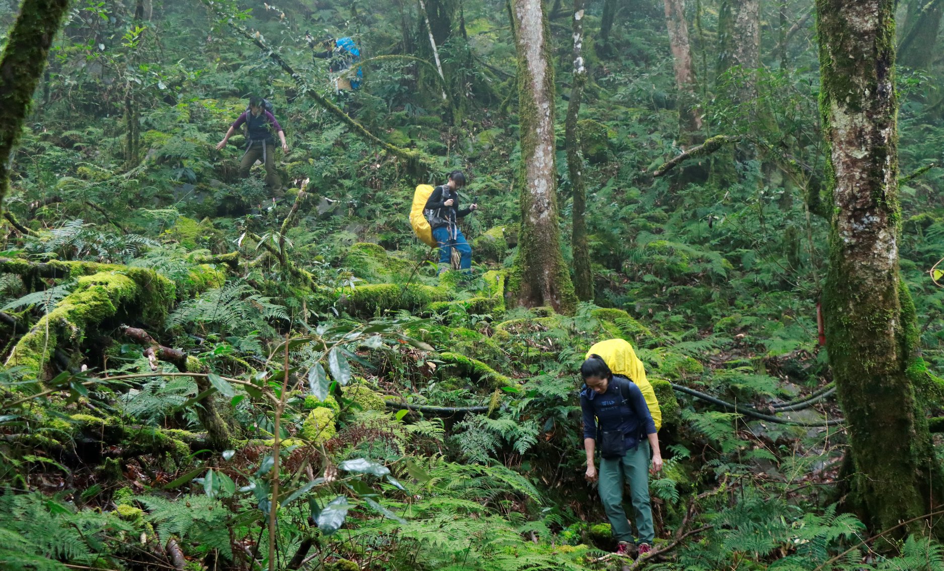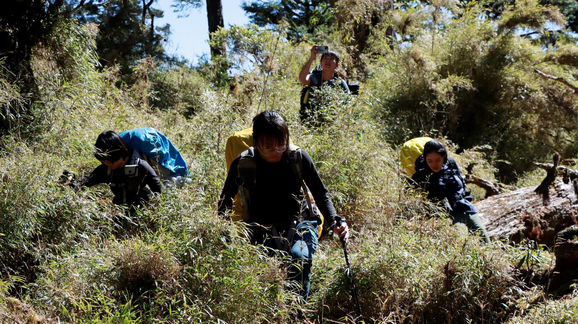 從神殿入口那棵大倒木開始,我們朝著箭竹林稀疏的地方爬上去,腳下厚又鬆軟的腐殖層時刻提醒這兒已不再是受到人類關照的路徑。起初路況還挺樂觀,大夥兒各自循疑似獸徑的軌跡往前探索,倒也走得順暢安穩,雖然有幾處落差較大需要手腳並用,卻也難不倒身經百戰的夥伴們。