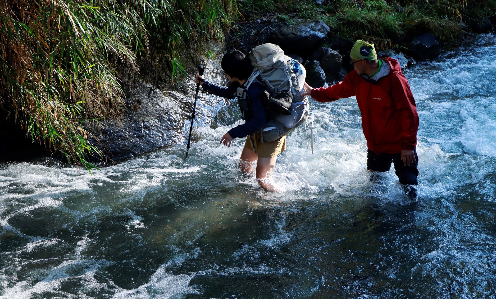 經過一夜晴朗,夫布爾溪的水位已經下降不少,我們咬著牙忍受冰冷水流和溪底卵石帶來的刺痛感,像螃蟹亦步亦趨橫渡對岸。「過溪的時候要看向上游。」政翰站在水中央用身體擋住下游落差形成的渦流,還不忘一邊指導,讓大家倍感安心。