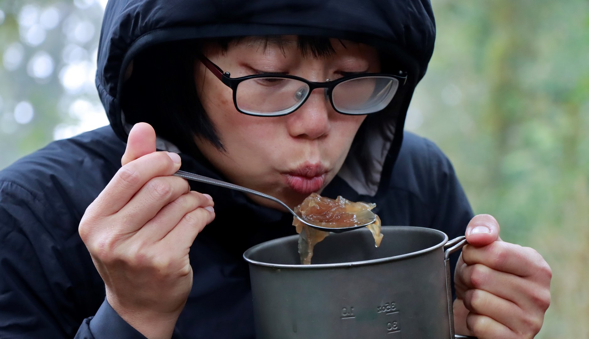 天色向晚,我們拉好天幕生火煮食。今晚嘗試用獨享杯濃湯粉做義式燉飯,搭配紫菜、小麥豆卷和娃娃菜,結果非常成功:輕量、美味、健康,又兼具飽足感。飯後再燒一鍋沛帶來的「心肝寶貝茶」,香氣溫和怡人,暖暖的茶湯下肚,從五臟六腑到四肢百骸頓時舒緩又放鬆。