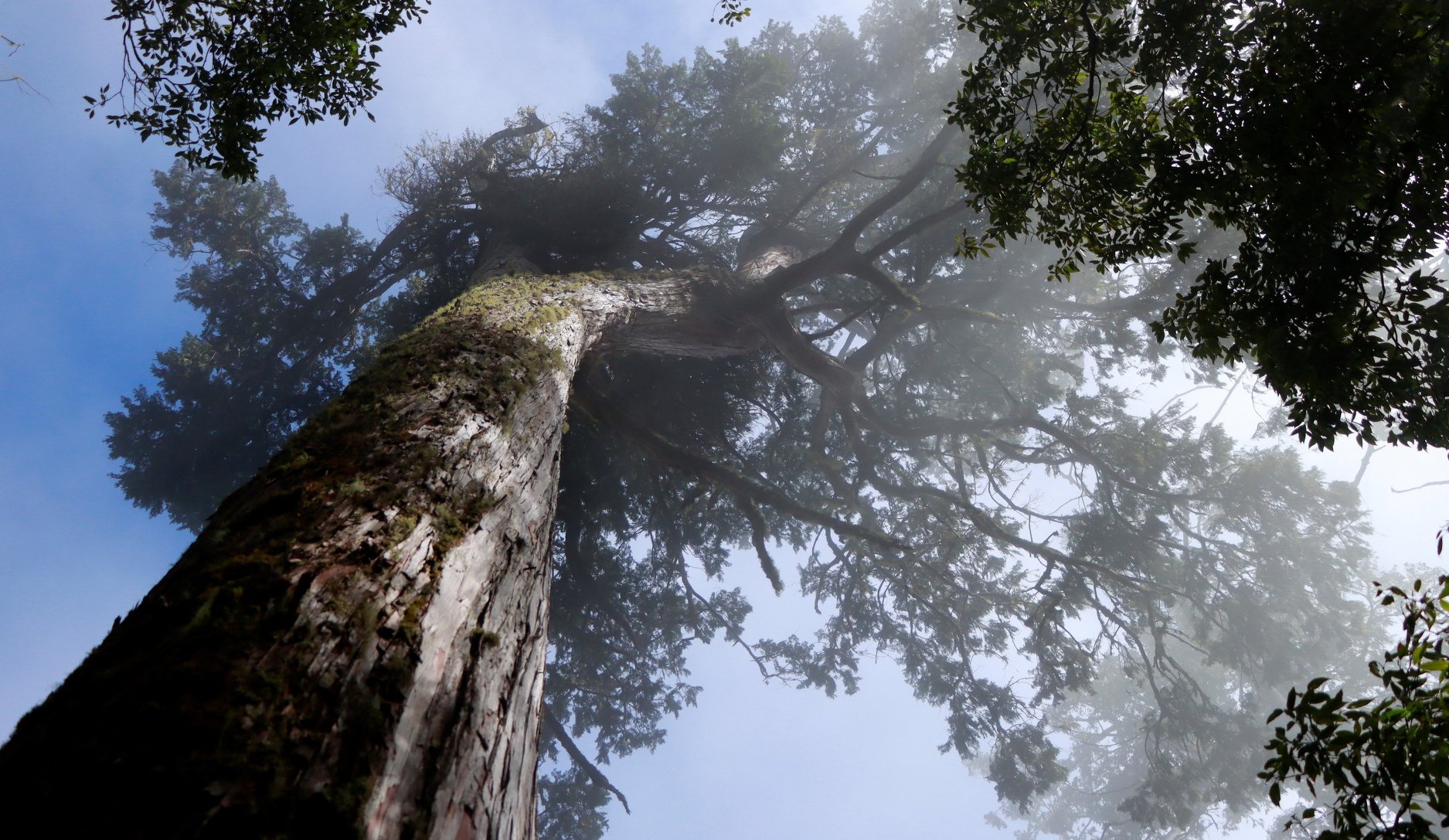 鑽過橫跨乾溝末端的「神殿之門」,攀上快比人高的「神殿之檻」,筆直聳入雲霄的巨木矗立眼前。扁柏神殿到了。所有人停下腳步,移動的嘈雜頓然停歇,空氣安靜得只剩下心跳震動。我想大口呼吸,卻又不忍呼吸。