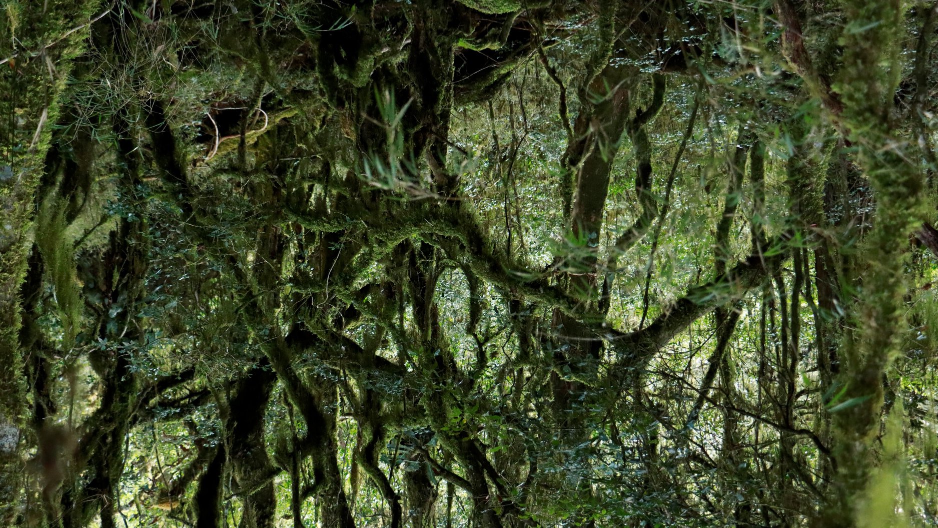 如同多數中海拔山區,米羅山翠綠且柔軟的森林透露此地潮濕多雨的氣候。這裡的樹枝葉茂密,略為浮腫的軀幹千姿百態,厚厚腐殖層上質地蓬鬆的枯木七橫八豎,岩石和樹皮每一處微小縫隙都長滿青苔。海拔一千七百公尺正處雲霧帶中央,山嵐吞噬本就單調的色彩,打從走進米羅山的窄小土路開始,世界除了灰階只剩下令人醉心的綠色。
