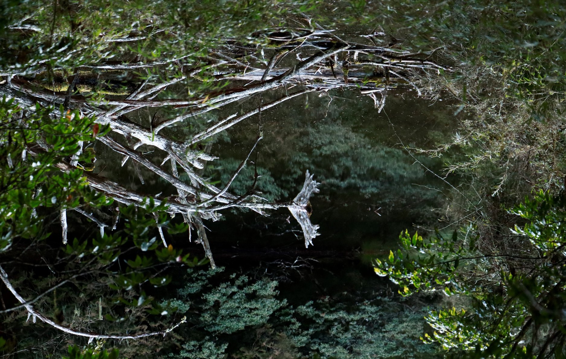逆時針繼續向前,會進入一片被扭曲樹幹包圍、堪稱魔法森林的空間裡,若是將陽光、地磁和萬有引力都抽離,恐怕會分不清東南西北和上下左右。魔法森林邊緣緊捱池畔之處有一片小沼澤,或許是除了池中倒木外觀看神殿池視野最開闊的地方,對岸山和森林完美映射在水中,幾乎無法區別倒影和實景的差異。