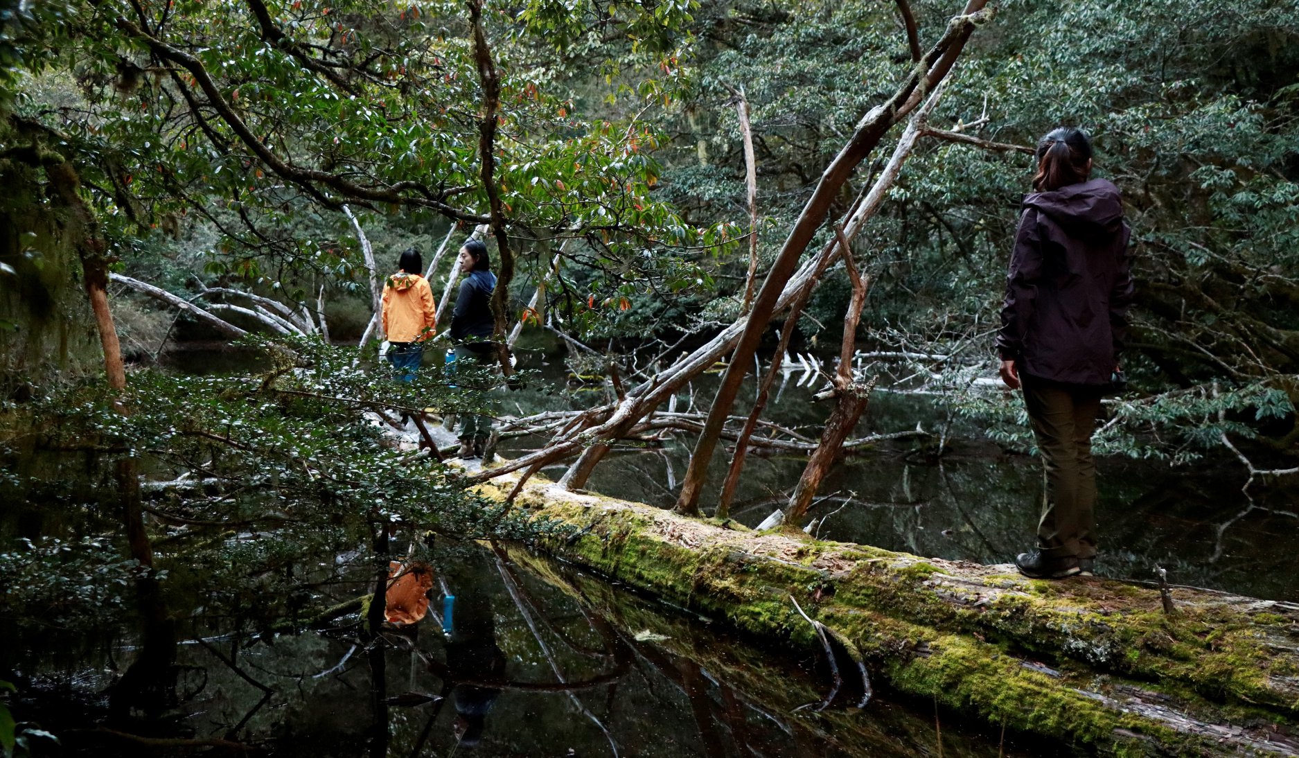 沛擁抱巨大挺拔的樹幹,小魚用臉頰磨蹭厚實樹皮上的濕軟青苔,Misha 跑進比人還高的樹洞裡仰望林梢。三胞胎神木彷彿幻化為人,成為我的隊友,迎接我走進這一段大樹之路。