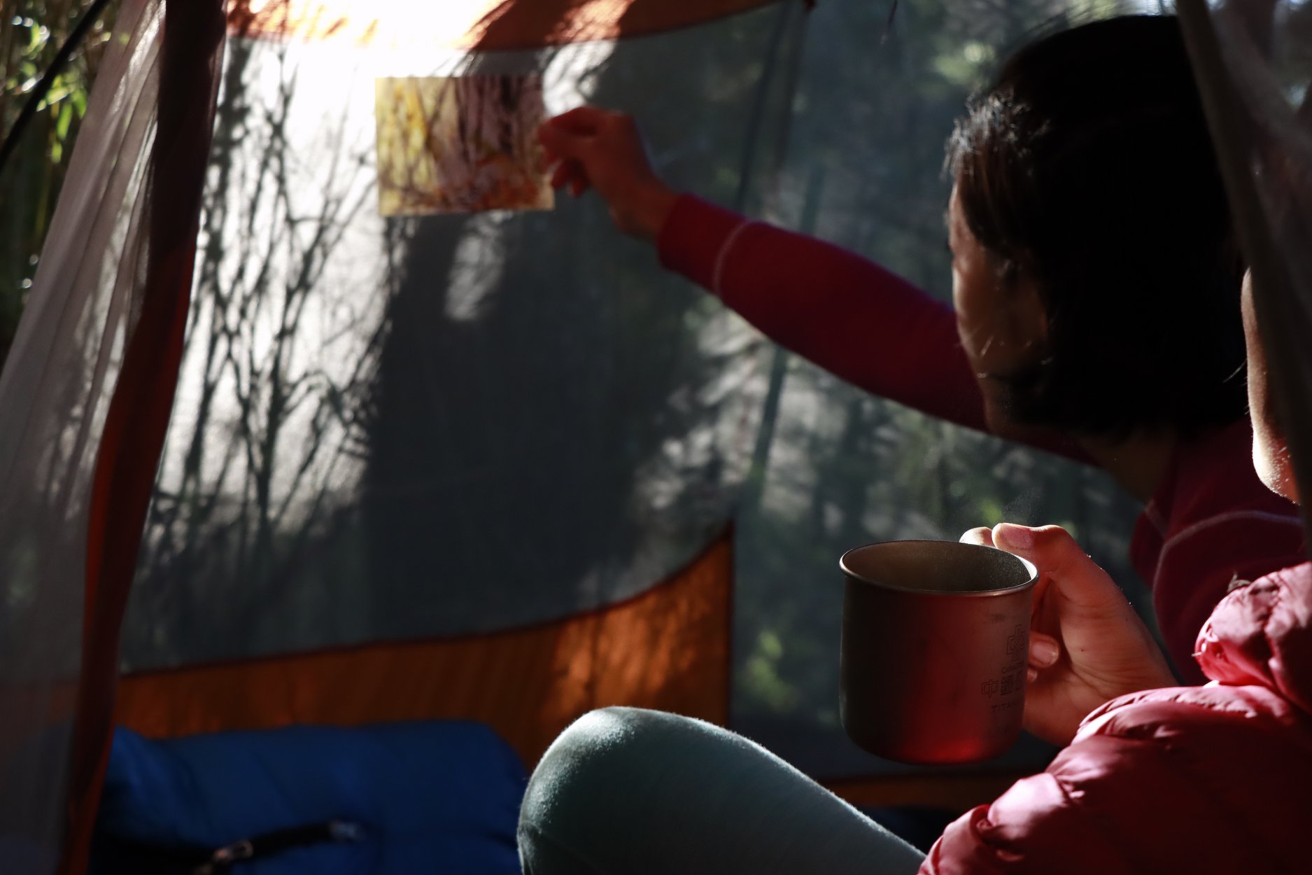 Misha 和怡華在下方不遠處箭竹環繞的小空地紮營,這兒非常隱密,風吹不進來,陽光卻能穿透樹梢將空氣都烘得暖呼呼的。搖曳的樹影在內帳網布上跳舞,帳裡帳外都能欣賞這一齣森林出演的皮影戲。