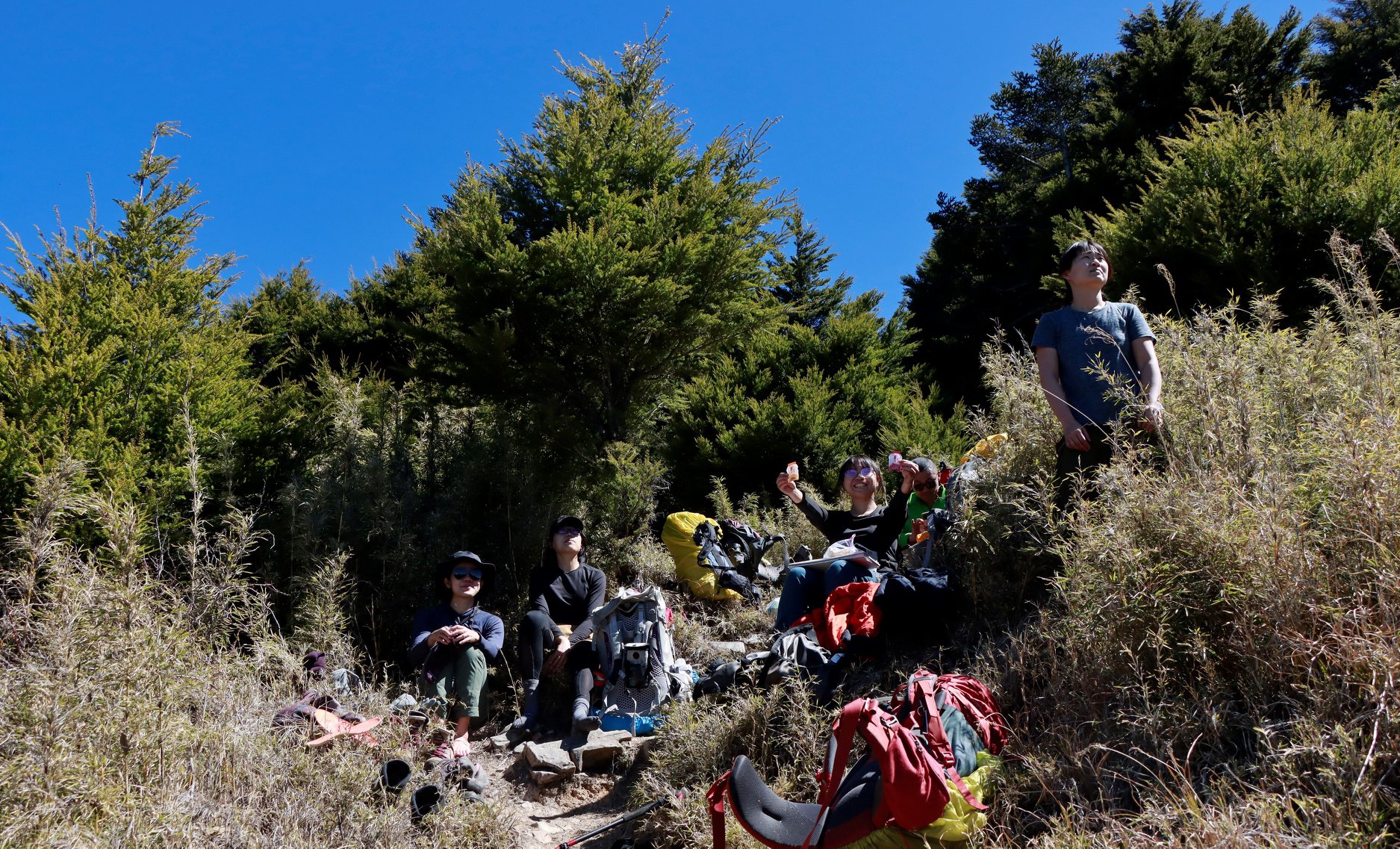 看見我們悠哉從容,在樹下畫畫,在樹幹上曬太陽,在箭竹叢裡煮咖啡,小哥流露出既新鮮又羨慕的神情,說也想和我們一樣走耍廢行程。不過,聽到我們打算走六天去武陵農場,兩位小哥仍是大感訝異。在他們的心目中,相同的行程走四天是標準,六天著實太過糜爛了。