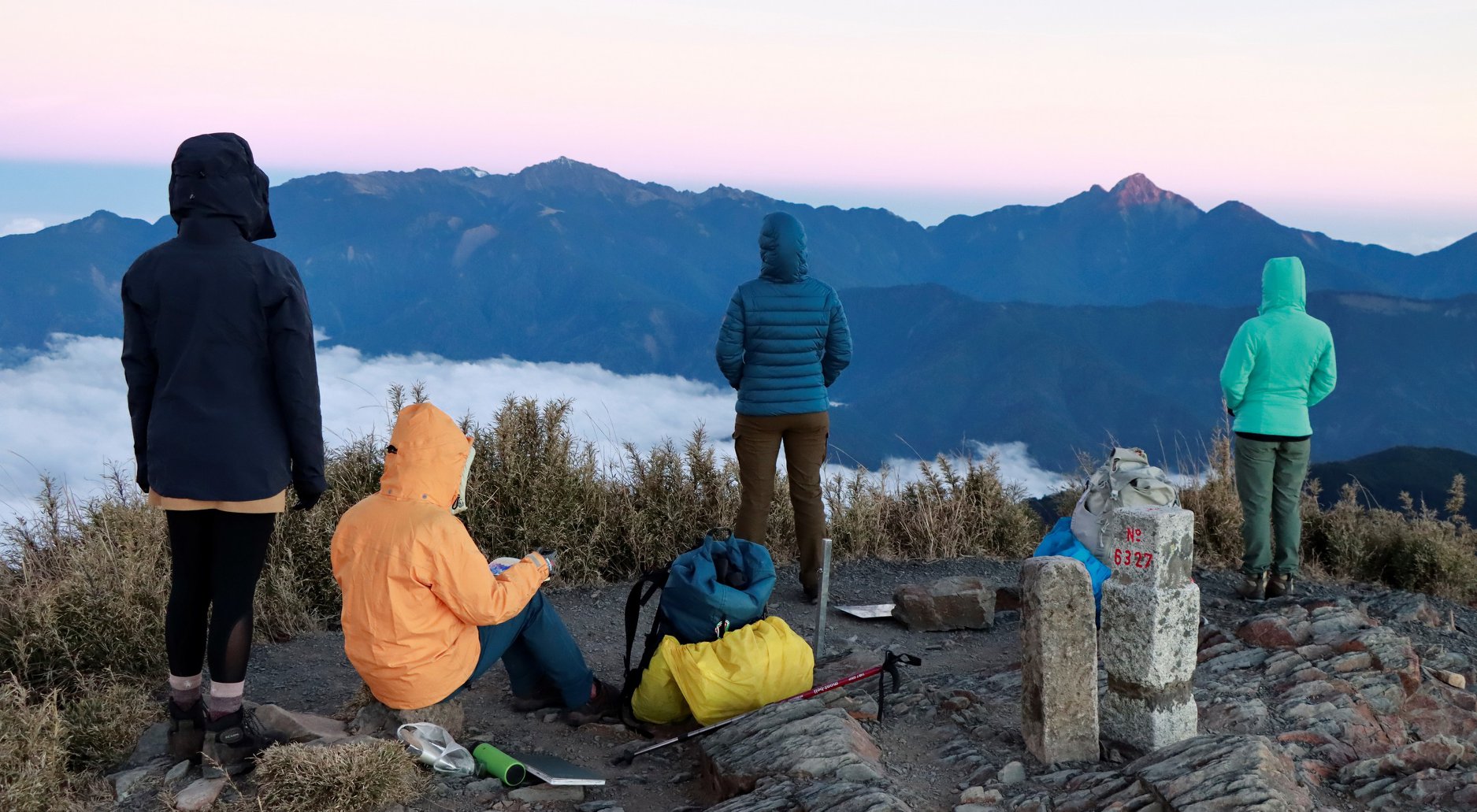 行進五個小時,歇腳五個小時,藍天在移動和駐足交錯間慢慢轉變成鵝黃色,而當我們終於登上桃山時,遠方地平線都染上蜜橙和丁香紫。從地面延伸到天頂的粉色漸層如夢似幻,我想,所謂天堂美景也不過如此吧!