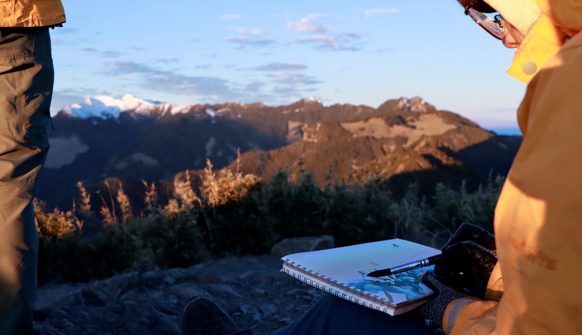 我們沒有在山頂多逗留,而是轉移陣地到不遠處能夠清晰眺望整條聖稜線的小草坡,大夥兒隨意散落路徑兩旁,咖啡跟畫這次依舊沒有缺席。