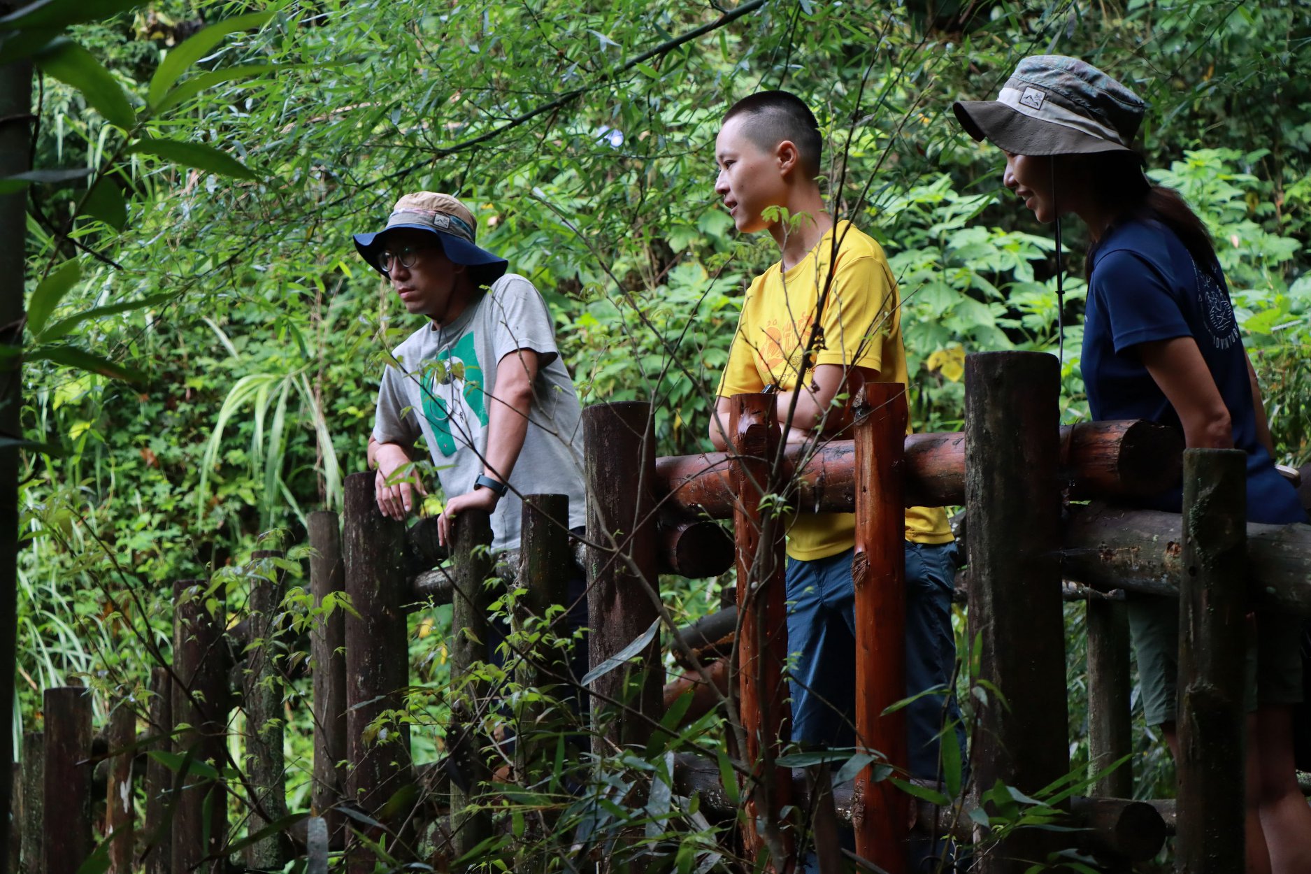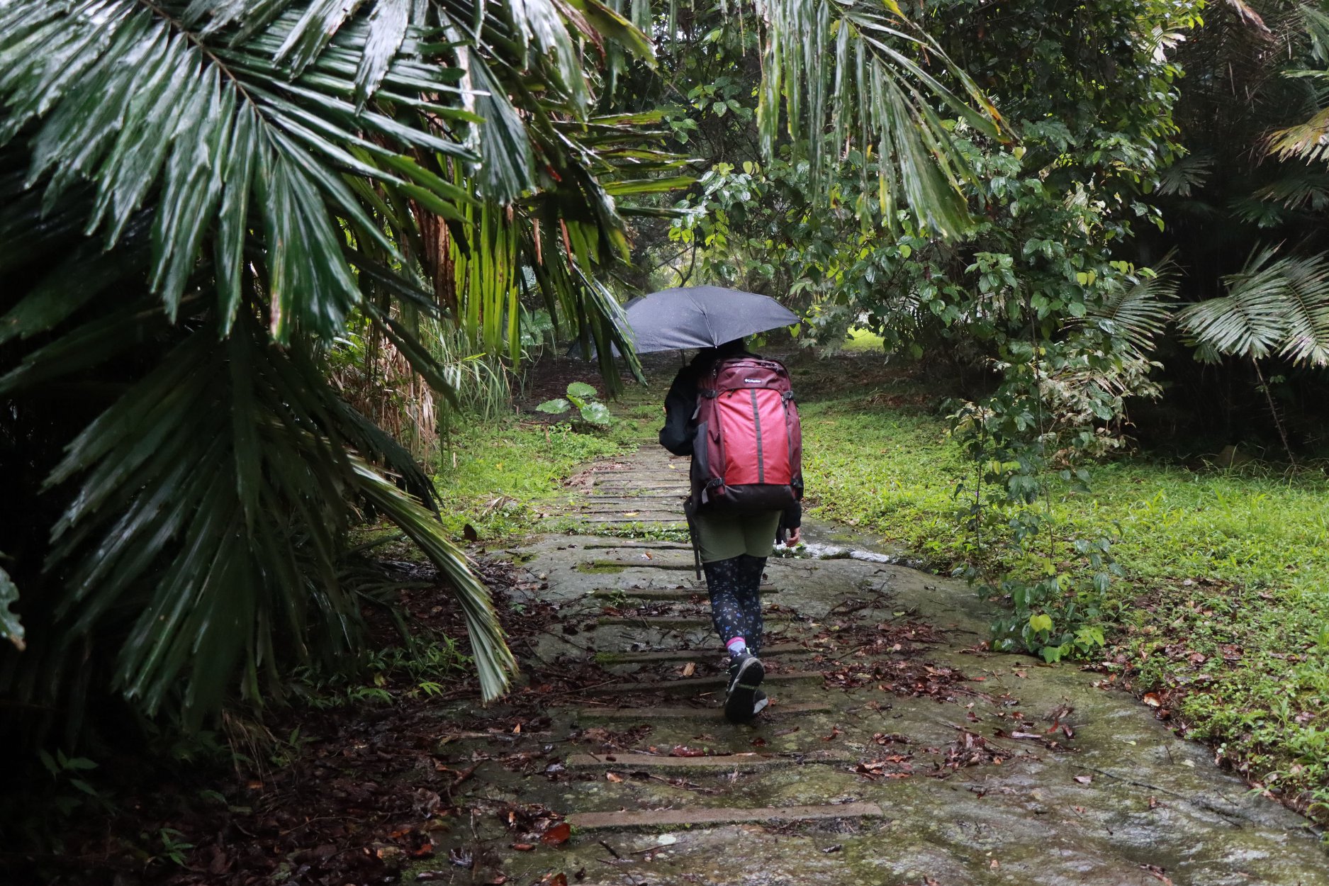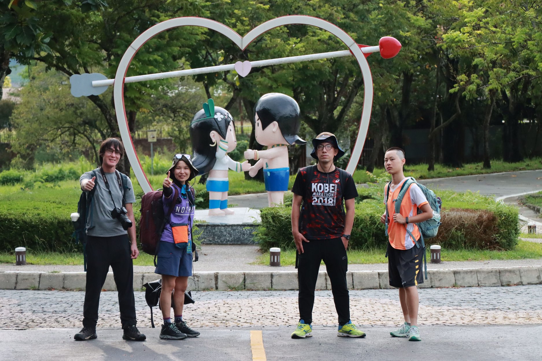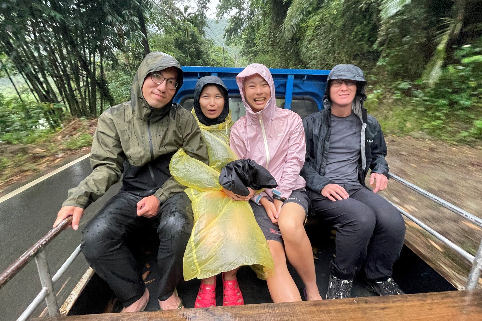 聊得正起勁時,突然下起滂沱大雨,天氣變得涼爽許多,卻也讓大家都發懶了起來:「許大!我們可以叫接駁車嗎?」哇!這樣作弊可以嗎?認真魂的我,有點心虛。不過又因為雨實在太大,也抝不過夥伴們的要求。好吧!坐車吧!
