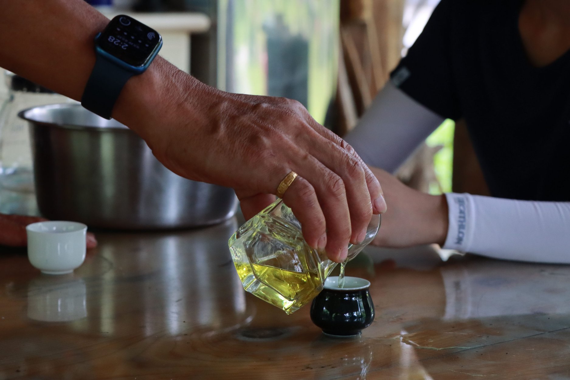 老闆娘一溜煙地走進廚房,叫我們先去泡茶,十分鐘之後再進來吃飯!於是乎,我們走進屋前小廣場。老闆說:「喝茶?」我們還害羞地來不及應答,「還是喝酒?」說著就舉起高粱!